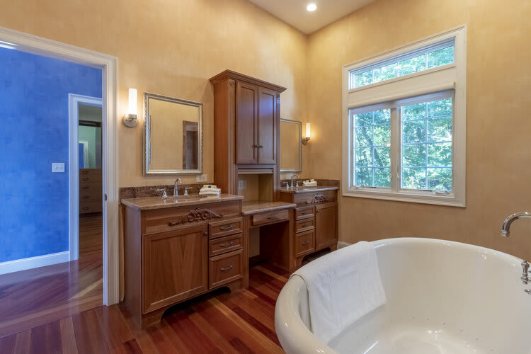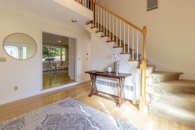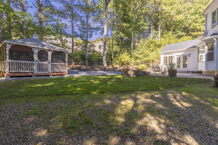 This spacious and private custom Cape offers the amenities that today's buyer is looking for. Enjoy a very spacious and bright first-floor master bedroom with an en-suite full bathroom that features a walk in closet and its own private laundry. Step out of the master into your brand new kitchen with dining area and private back deck. This makes the perfect living arrangement for extended family or the family's au pair. Enjoy hardwood floors, 9' ceilings, recessed lights and large windows offering gorgeous views of nature in every direction. The main kitchen features an open floor plan with custom cabinetry, kitchen island, and custom wet bar perfect for entertaining. The newly crafted 2nd master bedroom features heated floors all throughout and large bay windows with scenic views. Newly updated roof, heating and cooling system, and hardscape walk way make this a true move in ready luxury home!