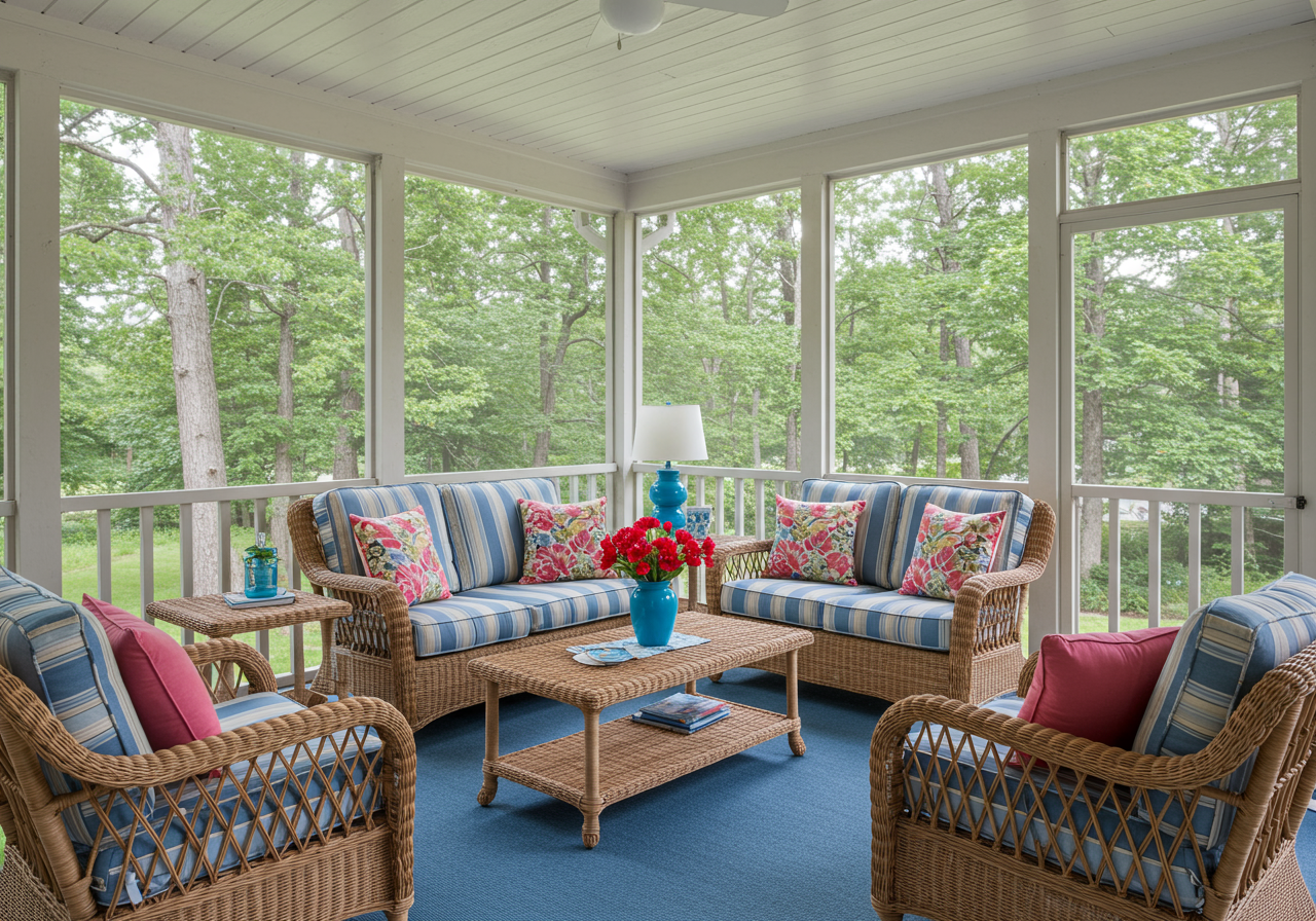 The living areas are bright and airy, designed to bring the outdoors in. The screened-in rear porch, which faces the woods, offers a serene retreat where you can enjoy your morning coffee or unwind in the evenings. It’s the perfect spot to soak in the tranquil surroundings while remaining sheltered from the elements.